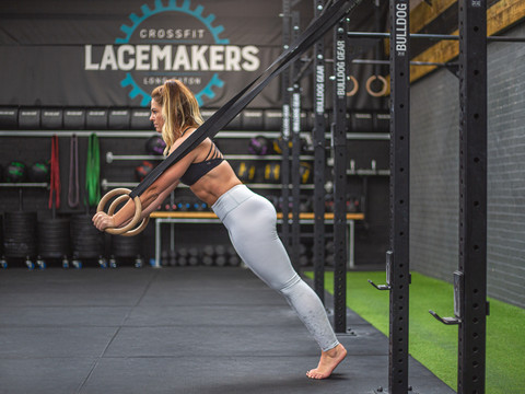 Lengthen the ring straps so they’re nice and low to the floor. Take hold of the gym rings and walk as far forward as you can go with your arms extended. Perform a push up keeping a hollow body, you might feel unsteady at the start, but practising with help build better stability and control in your push-ups off the rings. To make this movement harder, simply step your feet back to become slightly more horizontal.